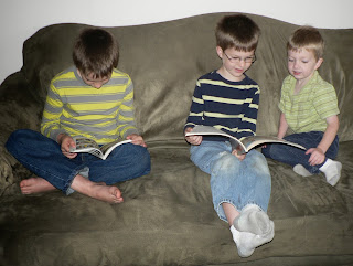 The morning after a library trip. Ah! Peace reigns in the house. :-) This is kind of a neat picture that shows a bit about interests and personalities. :-)