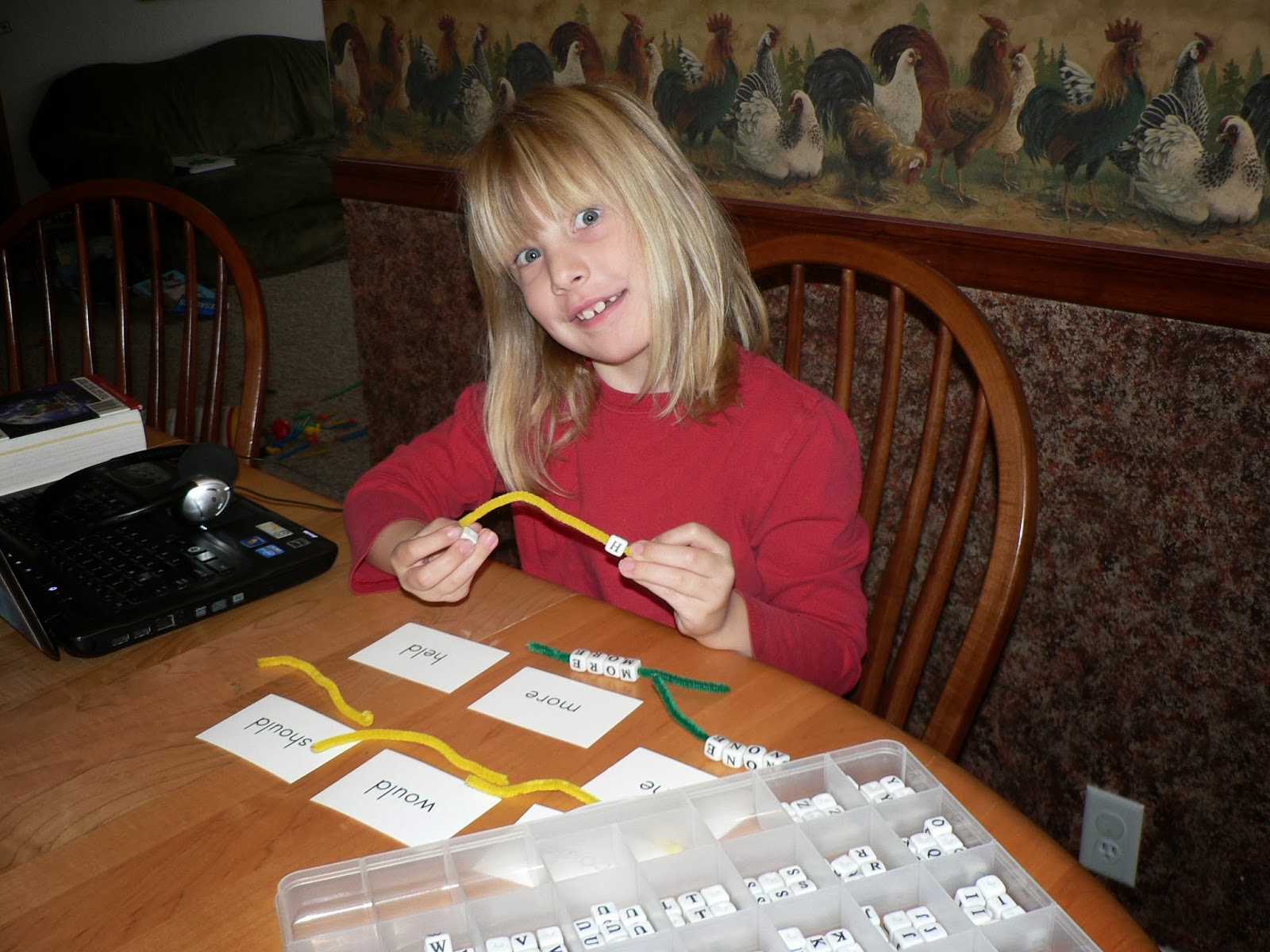 Please excuse my very poor penmanship. I've so wanted the ability to have a program where I can type and project it up on the wall because 1) we use the dry erase board but then have to erase it...can' really be "saved" 2) I have poor penmanship to begin with because I'm always in a hurry and then couple that with writing at a vertical surface....heaven help us. Ha! Anyway, we explored the dictionary a bit and reminded ourselves about what it can do to help us. Then next week the 3 older students will be working with